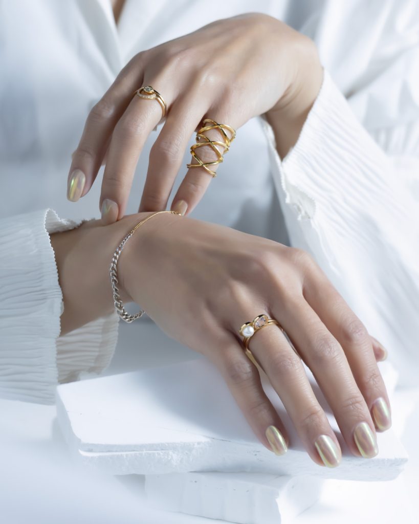 左手中指 K18・グレーダイヤモンドリング(K18、グレーダイヤモンド)¥216,700、K18・半円フォルムダイヤモンドパヴェリング(K18、ダイヤモンド)¥235,400、小指レースアップアーマーピンキーリング(シルバー925、ゴールドコーティング)、右手薬指 K18・パールリング(K18、アコヤパール)¥227,700、K18・モルガナイトリング(K18、モルガナイト)¥268,400、ブレスレット(シルバー925、K18)¥218,900 すべて税込