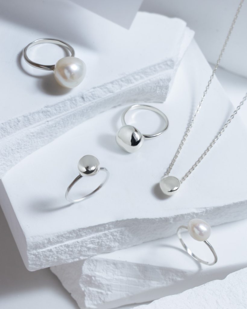 左上から時計回りに バロックパールリング大(シルバー925、淡水パール)¥28,600、シルバーモチーフリング大(シルバー925)¥28,600、シルバーモチーフネックレス(シルバー925)¥27,500、バロックパールリング小(シルバー925、淡水パール)¥17,600、シルバーモチーフリング小(シルバー925)¥17,600 すべて税込