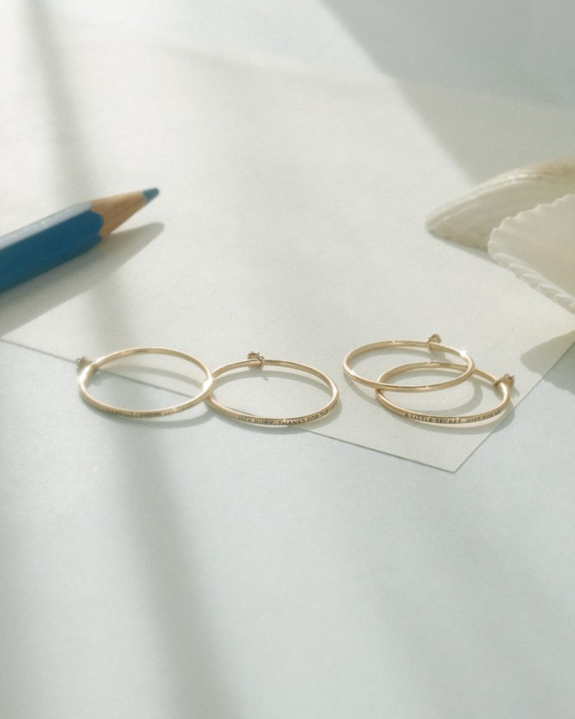 ご自身の大切にしたい言葉を刻めるプレーンタイプの他、”HAPPINESS IS IN MY HAND.”(幸せはわたしの手の中に。) ”A LITTLE SECRET,JUST FOR ME.”(私だけの小さな秘密。) ”HEY RUBY,THANKS FOR THE LUCK!” (ねえルビー、幸運をありがとう!) という3種類のメッセージが刻まれたタイプが揃います。