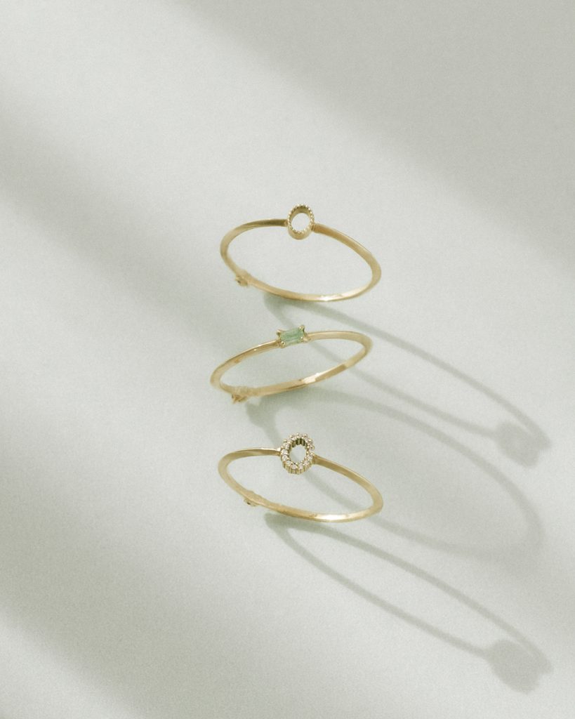 K18素材をメインに展開する〈e.m.gold〉からは、フラットで洗練されたシルエットのリングが登場。